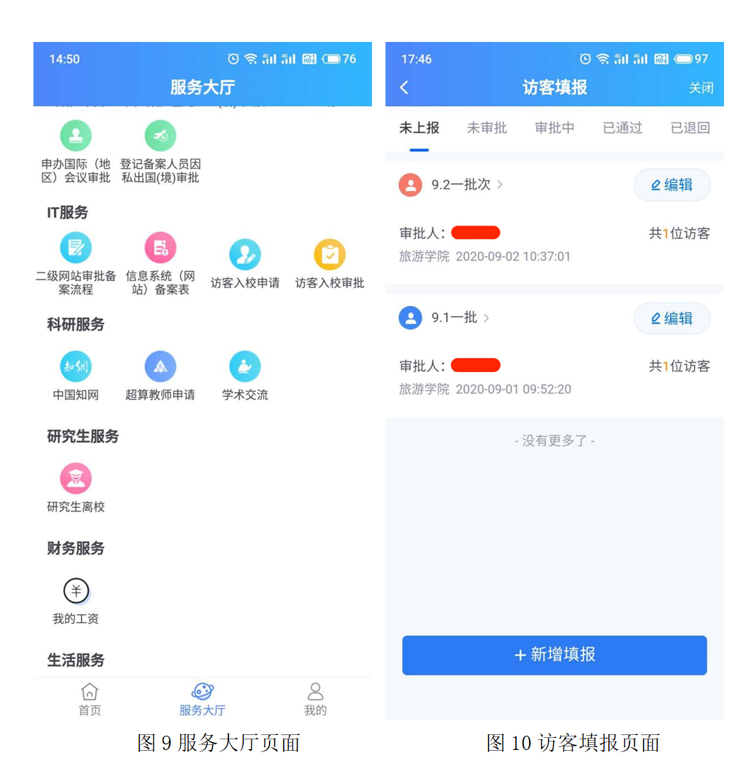 在“i师大”APP服务大厅页面打开访客入校申请页面(如图9),点击底部“新建填报”按钮打开添加批次页面(如图10):