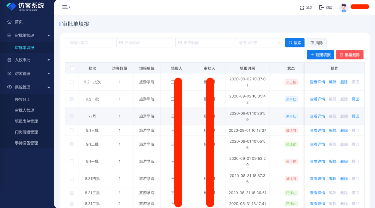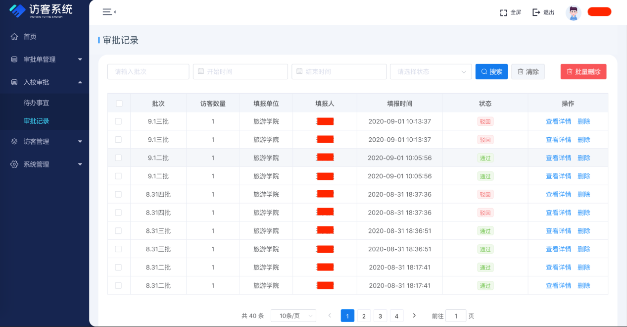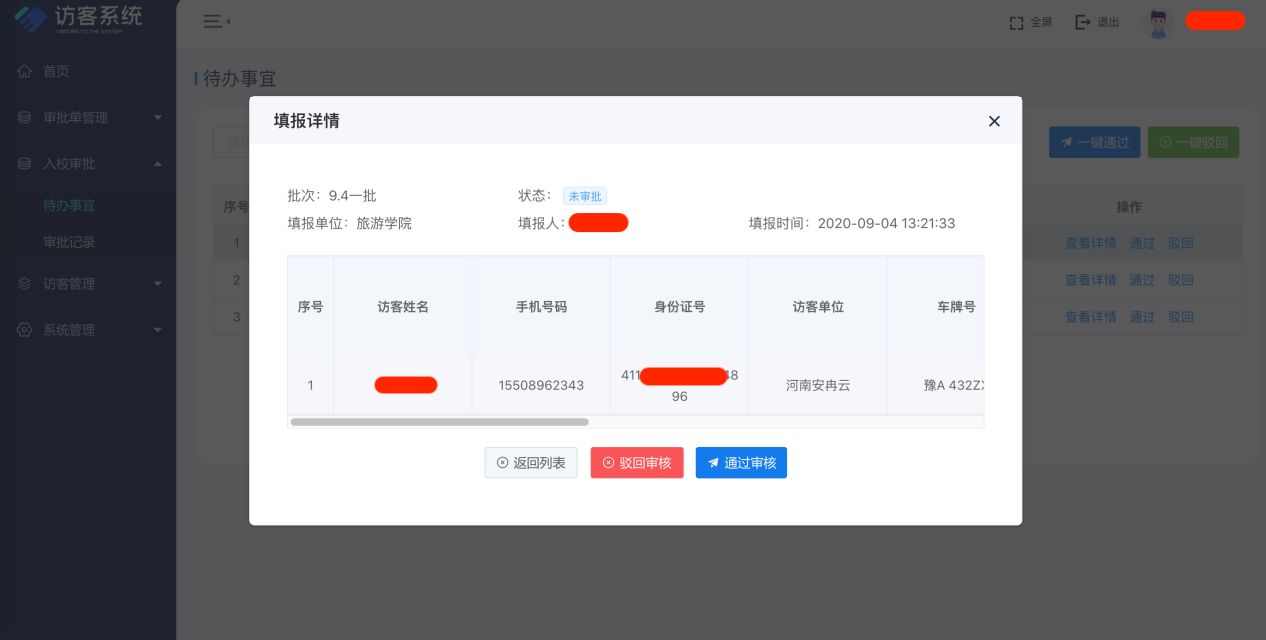 打开入校审批-待办事宜页面(如图5),每一个批次都可以查看详情(如图6),每一个批次都可以单独进行通过或驳回操作,通过时只需要二次确认,驳回时需要输入驳回原因用来告知填报人(如图7)。审批完成的数据无论通过还是驳回都在审批记录查看(如图8)。说明:部门领导审批和校领导审批步骤流程一致。