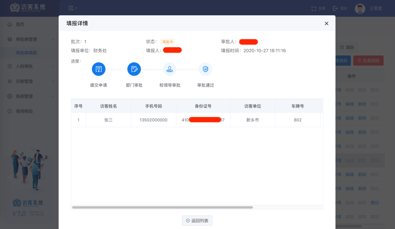 访客信息也可以手动添加在图12点击“添加访客”按钮打开新建访客页面(如图13),访客信息填写完成后直接提交申请即可。提交申请后可以查看批次详情页面如图14,该页面可以查看审批进度:提交申请->部门审批->校领导审批->审批通过,某一步骤已经完成相应图标背景则变成深蓝色,未完成的步骤则保持浅蓝色背景: