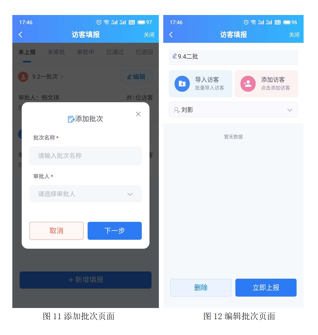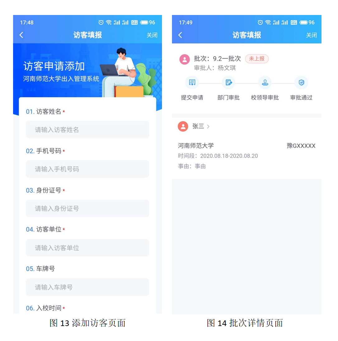 在编辑批次页面添加访客信息(如图3)。访客添加分为两种,一种是批量添加,一种是手动添加.访客信息填写完成后即可提交申请。