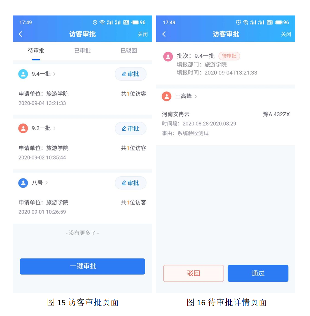 在“i师大”APP服务大厅页面打开访客入校审批页面(如图15),每一个批次都可以查看详情,不同状态详情页面不同,待审批状态的详情如图16,审批被驳回状态的详情如图17,待审批的批次在列表页和详情页面可以进行通过或驳回操作如图18,通过时只需要确认即可,驳回时需要输入驳回原因用来告知填报人。