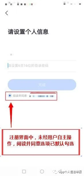案例6:某视频会议App在注册账号时,未经用户自主操作,默认勾选“阅读并同意”选项。