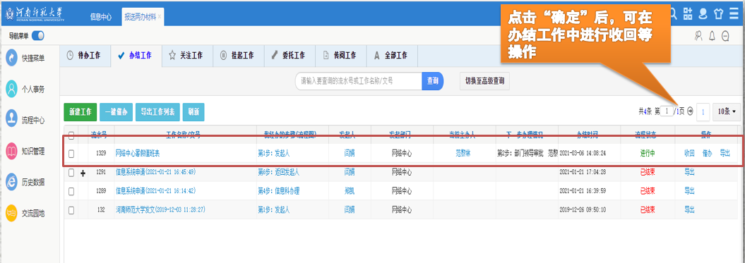 6、点击“确定”后可在办结工作中查看工作的名称、办理情况和流程状态,也可在“操作”任务栏中进行工作的收回、催办和导出操作。
