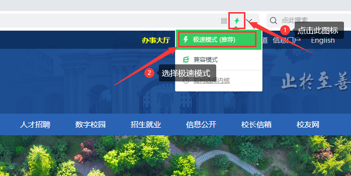 1、打开360浏览器,点击地址栏右边的模式切换图标,选择“极速模式”(如图一中①②所示)。