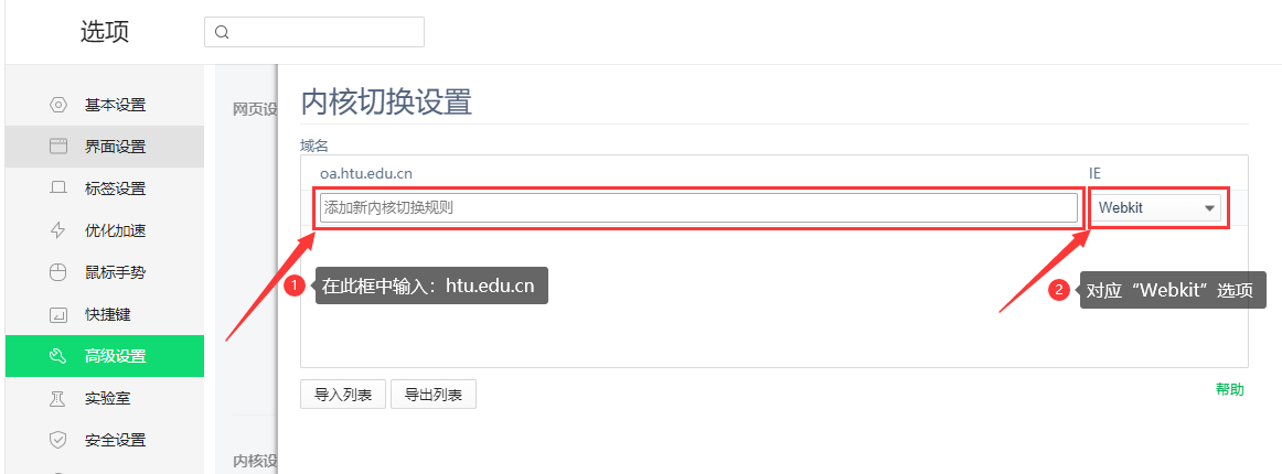 4、在“添加新内核切换规则”框中输入“htu.edu.cn”,后方对应Webkit选项(如图五所示),并按下回车键。回车后出现新增加的内核规则(如图六所示)。设置完毕后关闭360浏览器。