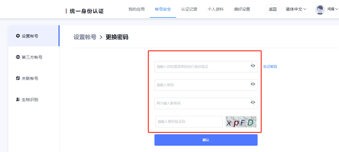 2、在统一身份认证页面中选择“账号安全”,可在该页面设置登录密码,绑定邮箱和手机号