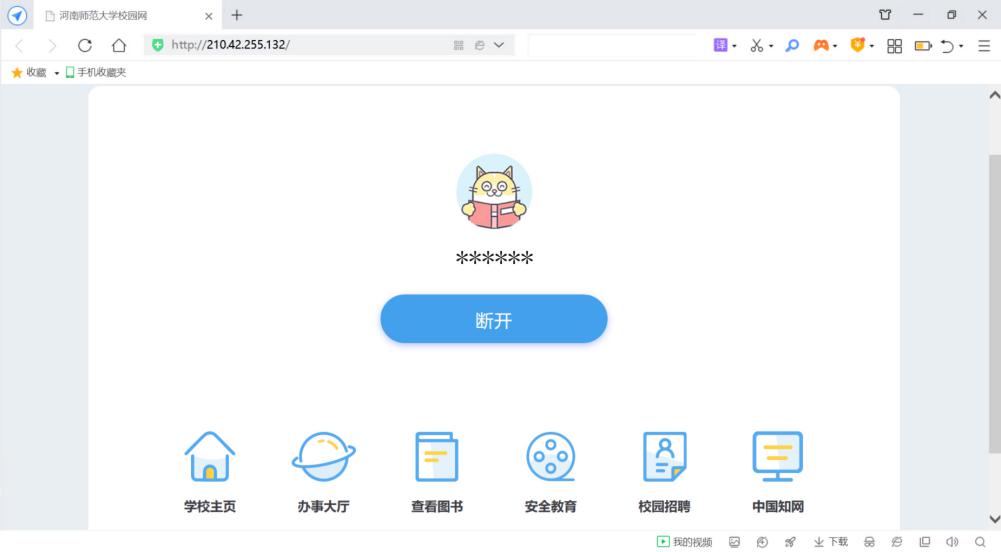 如需登出校园网,请在浏览器中输入地址:logout.htu.cn,即会出现如下图所示页面。点击“断开”,即可登出校园网。