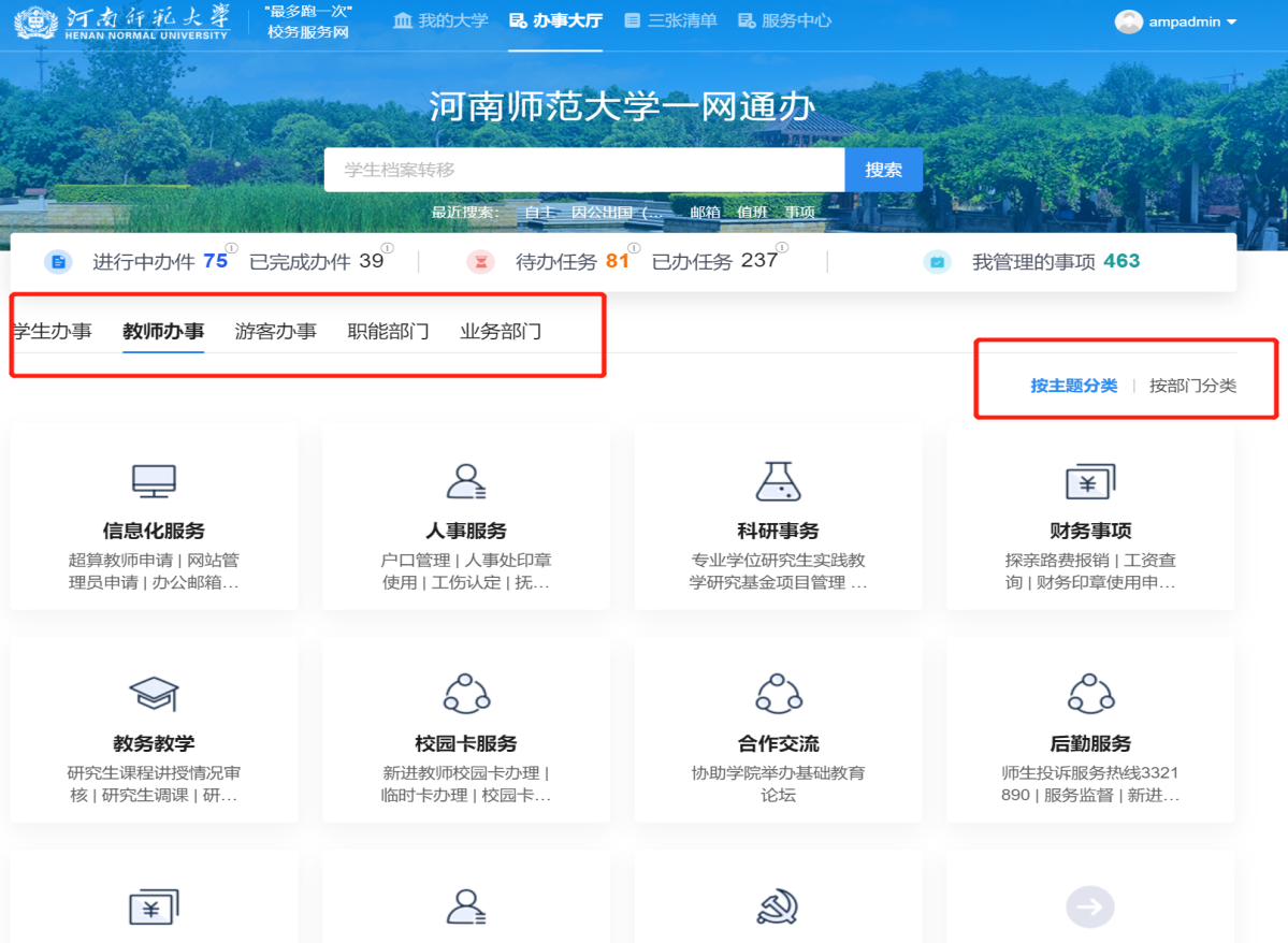 一网通办平台是为师生提供学校办事查询、网上办理的一站式网上办事平台。其建设目标是实现线上“一网通办”、线下“只进一扇门”、现场办理“最多跑一次”的服务体系,重点解决跨校区和跨部门之间业务办理不便、师生办事体验差等问题。管理人员可在线审批、查看各级审批意见,并享受待办事项提醒、数据自动汇总、统计等功能。