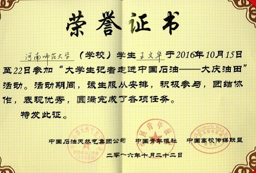 10月15日至22日,由中国石油天然气集团公司和中国青年报社主办的“感知石油力量·感受石油精神——大学生记者走进中国石油新闻实践活动”在黑龙江省大庆市大庆油田开展。我校大通社学生记者、生命科学学院2014级学生王文华参加了此次活动。活动中王文华表现积极,受到了活动主办方的赞赏,为我校赢得了荣誉。