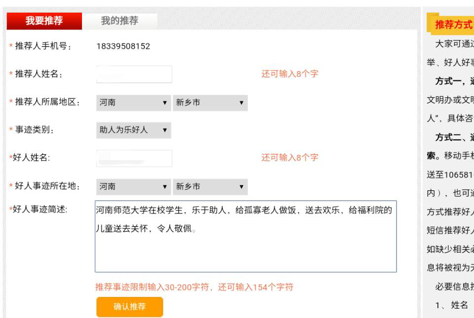 各学院: 今年是全国道德模范和河南省道德模范的评选年,同时也是我校全国文明单位的届满考核年,我校将加大力度深入开展“我推荐、我评议身边好人”工作,促进形成学习、崇尚、关爱、争当道德模范的长效机制和浓厚氛围,用优异的成绩迎接十九大的胜利召开。现将4月份“身边好人线索”推荐及评议相关工作说明如下: 一、“新乡好人”推荐评选工作 今年,新乡市文明办在《新乡日报》开辟“新乡好人榜”专栏,每月刊登10位新乡好人名单,并在新乡文明网上登载好人事迹,新乡好人可优先推荐为新乡市道德模范候选人。请各学院每月最后一个工作日之前推选1名以上(含1名)好人榜候选人及事迹,尤其注意挖掘寻找和发现助人为乐类、诚实守信类、孝老爱亲类型的90后好人榜候选人。候选人须经各学院了解、审核后报送至校文明办,资料包括:3000字左右和300字左右的事迹材料各1份,一寸免冠近照彩色照片一张(像素240*360,小于30k,红底),其中3000字事迹材料请参考附件2。 二、推荐身边好人线索工作 各学院通过中国文明网网络推荐平台推荐好人线索。推荐方式如下: 方式一:网址:http://haoren.dc.10086.cn/或通过手机扫描线索推荐平台二维码登陆平台(或者采取点开二维码图片,然后长按图片,选择识别图中二维码,也可以直接进入推荐界面)。打开链接后请填写移动手机号、图形验证码,点击获取验证码,填写验证码后登录,点我要推荐,填写相关内容。(线索推荐平台二维码见下图)