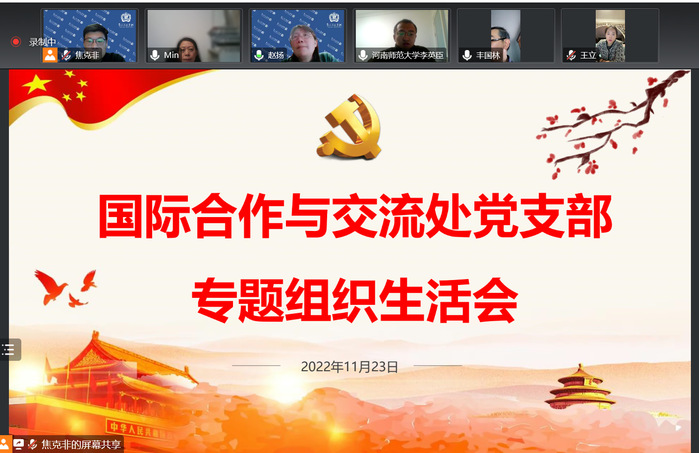为深入学习贯彻党的二十大精神和习近平总书记视察河南安阳重要讲话精神,为早日实现学校“双一流”创建目标积蓄力量,11月23日下午,国际合作与交流处党支部以“深入学习习近平总书记视察安阳重要讲话精神,大力弘扬红旗渠精神”为主题,采用线上会议形式,召开专题组织生活会。会议由国际合作与交流处处长、党支部书记赵扬主持,党员发展对象列席会议。