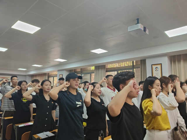 大会在雄壮的国歌声中开始。全体毕业生党员在鲜艳的党旗面前重温入党誓词,不忘初心,恪守承诺。