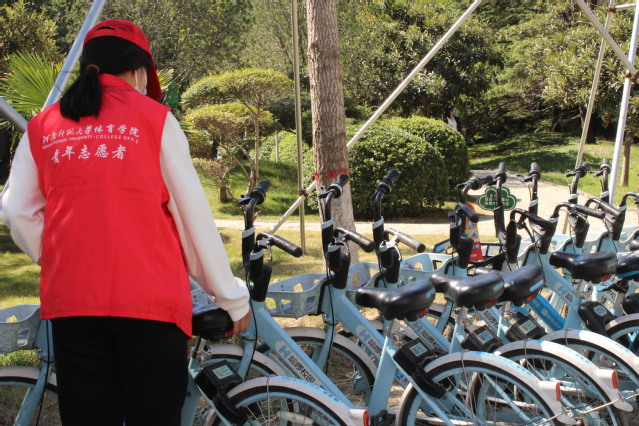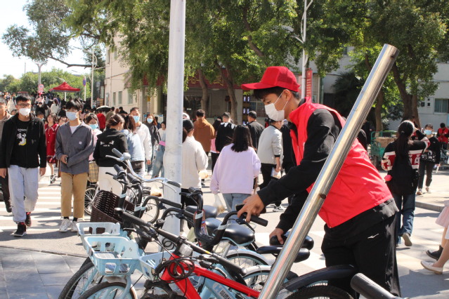 活动伊始,由带队老师为队员发放红马甲与小红帽,并仔细讲解志愿服务工作要点和任务分工。活动中,全体志愿者干劲十足、勤勉自律,坚守岗位、恪尽职责,主动引导人员自觉将机动车、共享单车整齐停放在指定区域,对不文明行为进行劝阻并帮其改正,将未停放好的单车及车辆停放在指定区域。“在志愿工作中,我感受到了这个活动的意义,看着在大家的共同努力下,共享单车被摆放的整整齐齐的,既提高了同学们的自身素质,又缓解了缓解道路堵塞,让我更深刻的理解了‘奉献、友爱、互助、进步’的志愿服务精神内涵。”学生志愿者张艳珂说道。