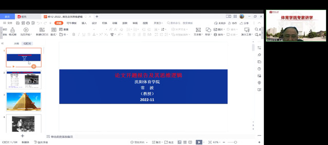 在师大百年校庆来临之际,为营造良好学术氛围,提高学院师生科研水平,11月15日下午,沈阳体育学院博士生导师常波教授应邀为学院师生作了一场题为《论文开题报告及其思维逻辑》的线上报告。体育学院院长岳贤锋、副院长孟国正、李玉周、刘光同及部分师生共200余人聆听了此次报告。报告由孟国正主持。