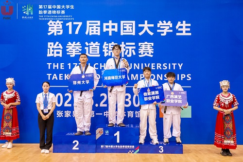 17届中国大学生跆拳道锦标赛由中国大学生体育协会、张家界市人民政府主办,张家界市文化旅游广电体育局承办,中国大学生体育协会跆拳道分会执行。共有来自浙江大学、中山大学、郑州大学等185所高校的1500余名教练员、运动员参赛,赛事规模创历届之最。我校跆拳道队由孟国正领队,梁潇任裁判员,司幸伟、于益民任教练员,王建设任队医,共23名运动员参加了甲组、丙A组、丙B组、丁组(超级组)四个组别的角逐,最终张起航、苏宏亮、王江涛、分别获得甲组、丙B组各级别金牌;王博文、姚言良、苏如娜获得超级组各级别银牌;卢鑫、赵桐彤、叶嘉怡、苗菁获得铜牌。我校被评为体育道德风尚奖运动队,体育学院教师于益民获得优秀教练员称号。