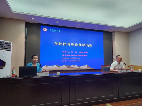 百年师大不忘初心、守正创新砥砺前行。7月5日下午,曲阜师范大学博士生导师曹莉教授应邀为学院师生作了一场题为《学校体育理论前沿动态》的专题报告。体育学院副院长孟国正、李玉周、夏树花及青年教师共100余人聆听了此次报告。报告由孟国正主持。