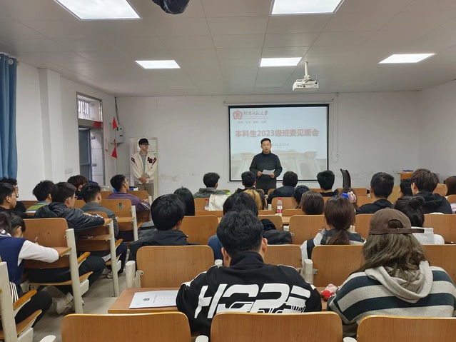 为提高2023级本科生班委的工作效率,进一步加强班委与团学组织的沟通联系,10月19日晚,2023级本科生于小白楼电教室召开班委见面会。2023级辅导员刘广宣、兼职辅导员刘力源及学生会各部门负责人、2023级本科生全体班委参加。此次会议由学院主席团成员李皓轩主持。
