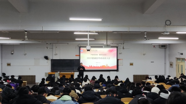 为树立学生诚信为本的道德理念,营造良好的考试氛围,推动考试公平公正进行,1月5日,我院2023级诚信考试动员大会在新五五四101教室顺利召开。2023级辅导员刘广宣主持会议,2023级全体本科生参加本次大会。