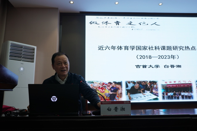 薪火相传一百年、不忘初心谱新篇。1与14日上午,教育部全国高校体育教学指导委员会委员,国家社科基金课题会评专家,吉首大学博士生导师白晋湘教授应邀为学院师生作了一场《近六年体育学国家社科课题研究热点与分析》的专题报告,学院院长岳贤锋、副院长孟国正、夏树花及青年博士教师共100余人聆听了此次报告。报告由岳贤锋主持。