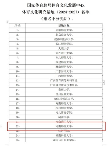 近日,国家体育总局体育文化发展研究中心公布了《体育文化研究基地名单的通知》,体育学院经自主申报、组织推荐、资格审查、现场答辩、专家评审、社会公示,最终成功获批体育文化研究基地,这是“十四五”期间体育学院在科研平台建设工作中取得的一项重要成果。
