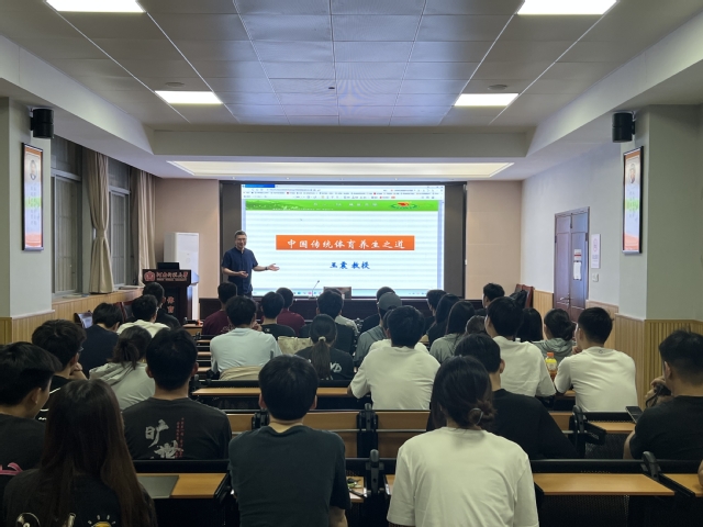 王震教授讲座围绕“健康中国需要中国传统体育养生”和“中国传统体育养生能为健康中国做出什么样的贡献”两个主要问题展开。从历史的角度梳理中国传统体育养生的发展脉络,从当代中国人民的健康实际阐述健身气功对健康中国行动的重要作用。授课期间,王震教授带领现场师生共同体验五禽戏、八段锦等传统中国体育养生套路,轻松活跃、幽默风趣的讲座,充分激发了在座师生的学习热情,会场内响起阵阵热烈的掌声。