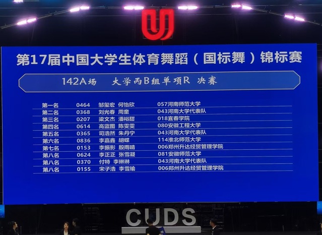 本届比赛由中国学生体育联合会主办,中国学生体育联合会大学体育舞蹈分会、中国学生体育联合会高职院校工作委员会执行,绵阳市教育和体育局承办,共有来自全国149所高校的1600余名运动员参赛。我校体育舞蹈队由孟国正任领队,陈自旺任教练员,共八名队员分别参加了五个组别的比赛。经过5-6轮的拼杀,4个项目进入了决赛。在决赛中,我校代表队成员们以精湛的技艺、优美的舞姿和顽强的拼搏精神,在众多优秀队伍中脱颖而出。最终,邹玺宏、何怡欣获得大学丙B组单项伦巴舞第一名;熊浚宇获得大学丙B组单人四项拉丁舞第二名、大学丙B组单人三项拉丁舞第二名、大学丙B组单人两项拉丁舞第六名;彭德欣获得大学丙B组单人四项拉丁舞第七名、大学丙B组单人三项拉丁舞第七名。