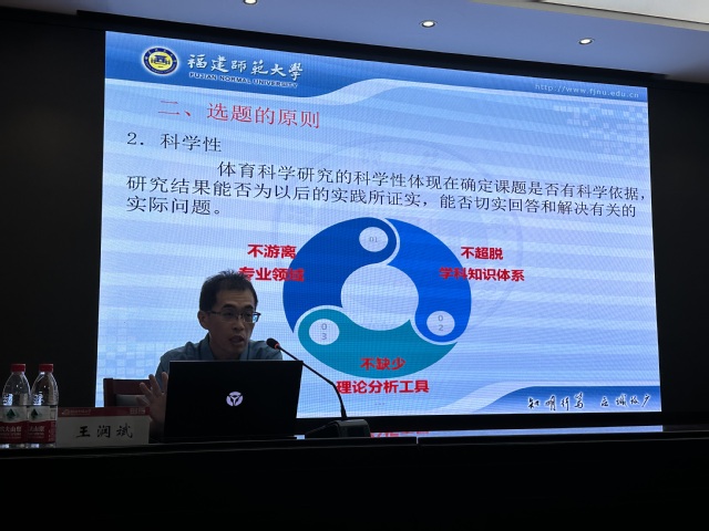 百年师大正青春、争创一流铸辉煌。6月18日上午,福建师范大学博士生导师王润斌教授应邀为学院师生进行了一场以《体育学研究生科研能力提升的经验与思考》为主题的专题讲座,体育学院副院长孟国正、李玉周,青年教师及在校研究生共计100余人聆听了本次报告。报告由孟国正主持。