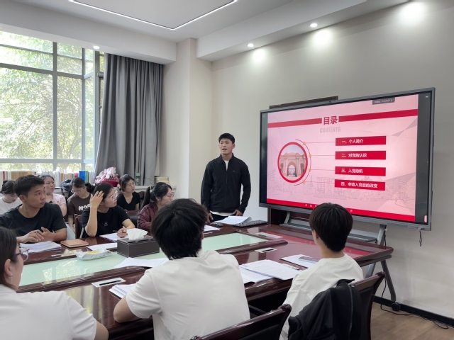 首先,谭支内同志汇报入党动机、对党的认识及未来发展规划,郑重承诺在预备期内从思想、工作和生活三方面发挥榜样作用,努力争做合格党员。入党介绍人韩改玲和林金艳两位老师就谭支内同志在入党积极分子期间的政治素质、工作能力等方面进行详细介绍,并对其能否入党表明意见。支委会报告了发展对象及其家属的政治审查情况。与会其他党员充分讨论后发表意见,一致认为谭支内同志思想上积极向党组织靠拢,行动上严格要求自身,符合预备党员条件。经无记名投票,大会全票通过接收谭支内同志为预备党员。最后,谭支内同志作表态发言,针对入党介绍人提出的意见和自身存在的不足,明确表达了今后努力的方向。