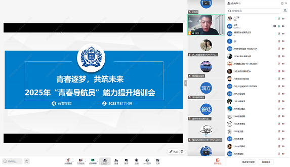 为切实做好新生迎新工作,保障入学流程顺畅有序,体育学院于8月14日组织召开“青春导航员”能力提升培训线上会议。各年级专兼职辅导员及全体“青春导航员”参与会议,会议由2025级新生辅导员吴笑主持。