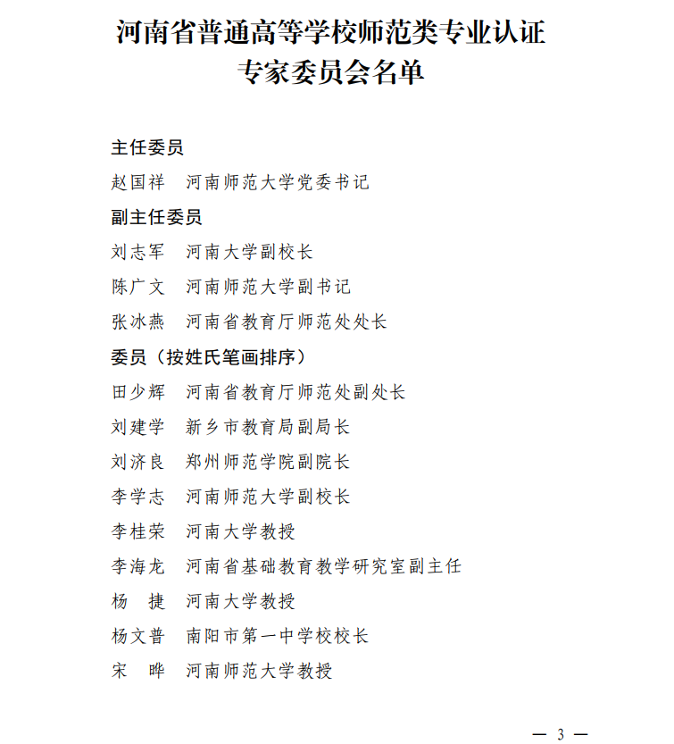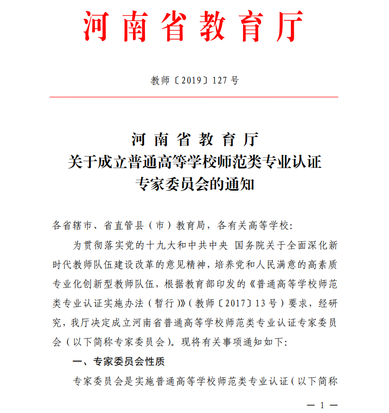 近日,河南省教育厅下发了《关于成立普通高等学校师范类专业认证专家委员会的通知》(教师〔2019〕127号),我校党委书记赵国祥担任专家委员会主任委员,副书记陈广文担任副主任委员,副校长李学志、党委教师工作部部长张顺利、教育学部部长宋晔入选专家委员会委员,项目办公室设在河南省教师发展评估院。