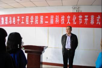 4月24日下午,物理与电子工程学院第二届科技文化节开幕式在物理北楼四楼隆重举行。我院党委副书记陈明银,团委书记刘博,13级辅导员孙晓及百余名学生代表共同参加了本次开幕式。