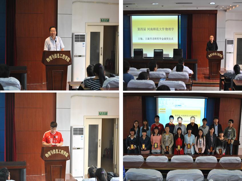 10月11日下午2:45,物理与电子工程学院在物理南楼二楼报告厅成功举办了第四届伟德官网下载苹果版物理学王勉、王淑芳老师奖学金颁奖仪式。物理与电子工程学院院长杨宗献、党委副书记陈明银出席颁奖仪式,团委书记刘博担任主持。