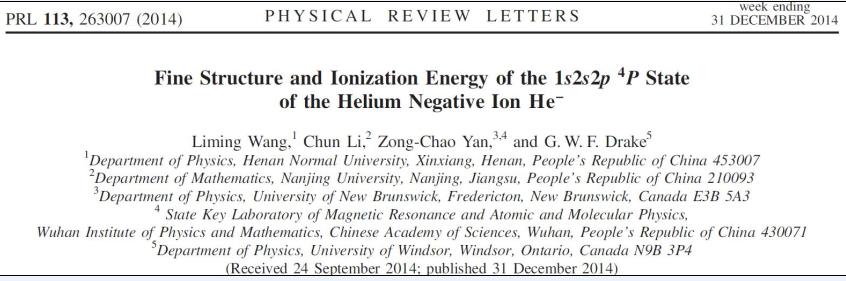 2014年12月31日,我校物理与电子工程学院王黎明博士的研究成果“ Fine Structure and Ionization Energy of the 1s2s2p 4P State of the Helium Negative Ion He−”在国际物理学顶级期刊Physical Review Letters【2014,113(26):263007】上发表。