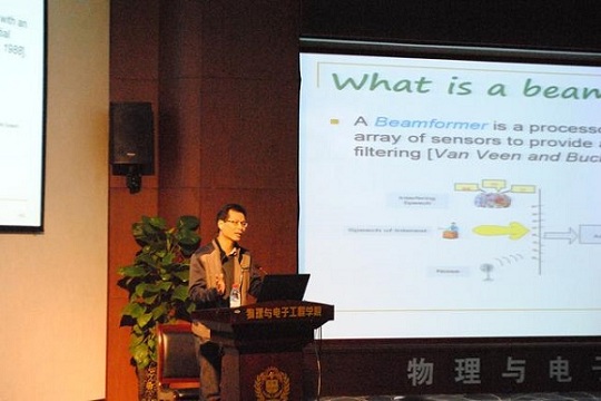 陈华伟教授的报告主要介绍了麦克风阵列处理技术。陈教授首先介绍了麦克风阵列处理技术在免提语言通信、助听器、多媒体等领域的广泛应用,并介绍了该技术的一些技术背景,包括麦克风阵列的功能、研究现状等和一些典型的应用实例。最后介绍了其课题组近年来在麦克风阵列波束形成方面的一些代表性的研究成果。