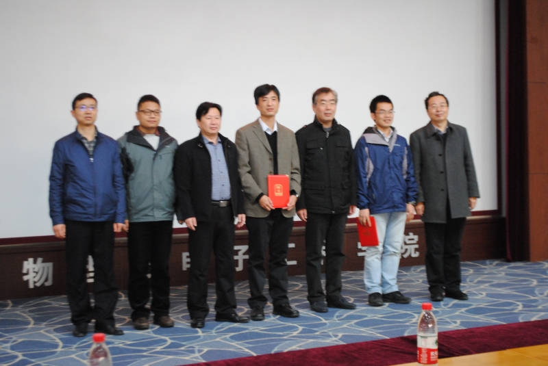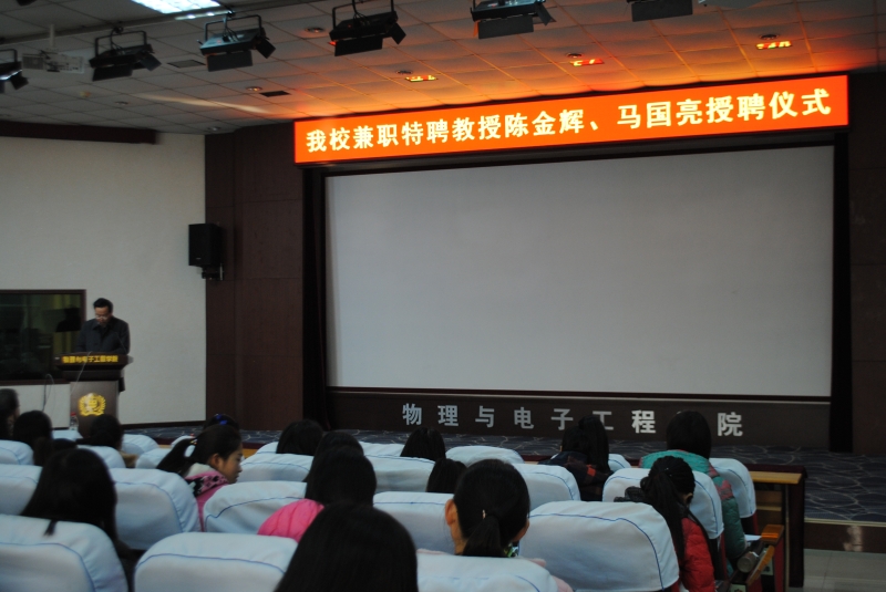 由于陈金辉、马国亮研究员取得了优异的科研成果,被我校聘为兼职特聘教授,副校长孙先科教授为他们颁发了聘书。孙校长在致词中表示热烈欢迎两位教授加入物理与材料科学学院,并对物理与材料科学学院表示祝贺。