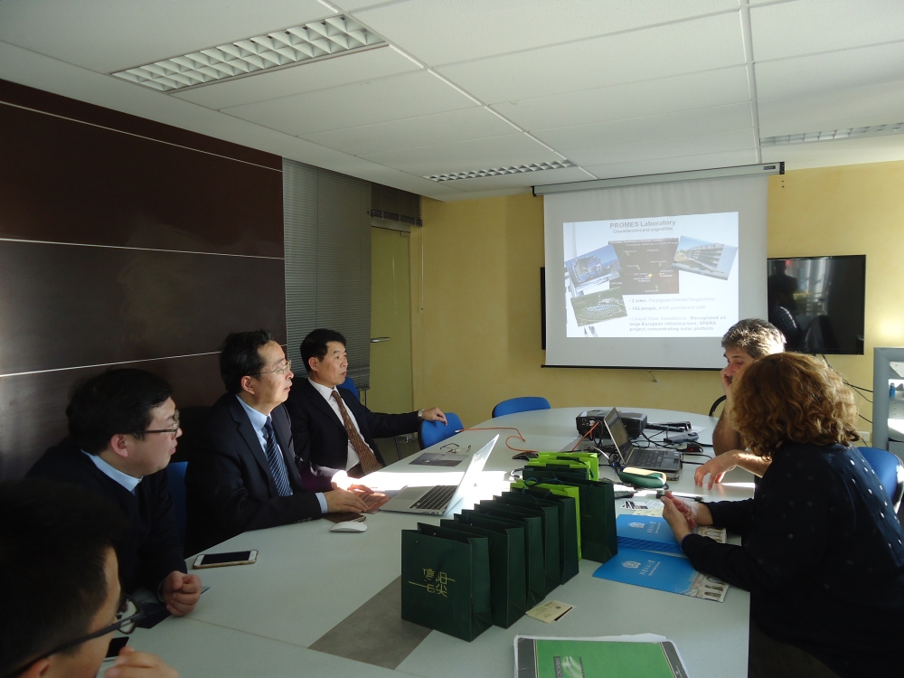 在访问PROMES实验室期间,实验室主任Dr Francoise Massines(弗朗索瓦·莫什尼斯博士)对常方高教授率团来访表示热烈欢迎,她指出:常教授此次率团访问将揭开两个实验室合作的新篇章。实验室常务副主任Laurent Thomas(劳伦特·托马斯)简单介绍了实验室利用化学气相沉积系统、等离子体辅助系统等实验手段研究新型太阳能电池材料与器件,详细讲解了实验室在1兆瓦聚光太阳能炉、10KW太阳能燃气轮机发电实验室、研究领域及最新取得的科研成果。常方高教授简要介绍了学校、学院的基本情况及实验室的发展现状,重点介绍实验室在硅基薄膜太阳能电池材料与器件、有机薄膜太阳能电池材料与器件及新型太阳能电池材料与器件等方面的研究工作。双方针对各自的研究内容、研究特色进行深入的交流,共同寻找双方可能合作的研究方向和课题。