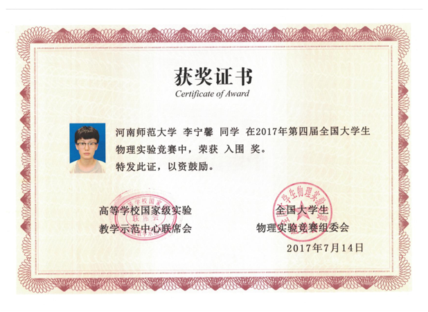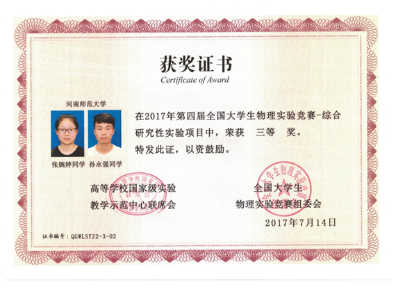 经过激烈的角逐,我校物理与材料与科学学院2015级光电信息科学与工程专业孙永强同学、物理学专业张婉婷同学在全国综合实验组排名第11名优异成绩荣获三等奖,2015级物理学专业李宁馨、李霏同学分别以第40、41名的成绩获得入围奖,提升了我校及物理学专业的影响力和知名度。此次竞赛的指导教师为我校国家级物理实验教学示范中心的毕小群、尚军老师。
