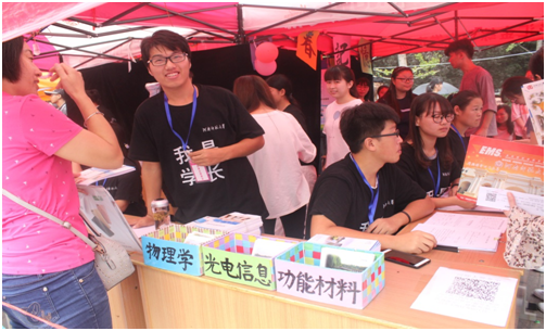 三、家校联系、合力育人:在迎新场地的休息区,家长可以扫描“物理与材料科学学院家长交流群”的二维码。学院主管学生工作的副书记、学生辅导员、班主任等在微信群中为学生家长解疑答惑。辅导员也会定期在微信群中分享学生在校期间的思想动态、学生活动、学业成绩、上课考勤等,同时听取家长对于学校和学院的建议,以便加强家校联系、形成育人合力。