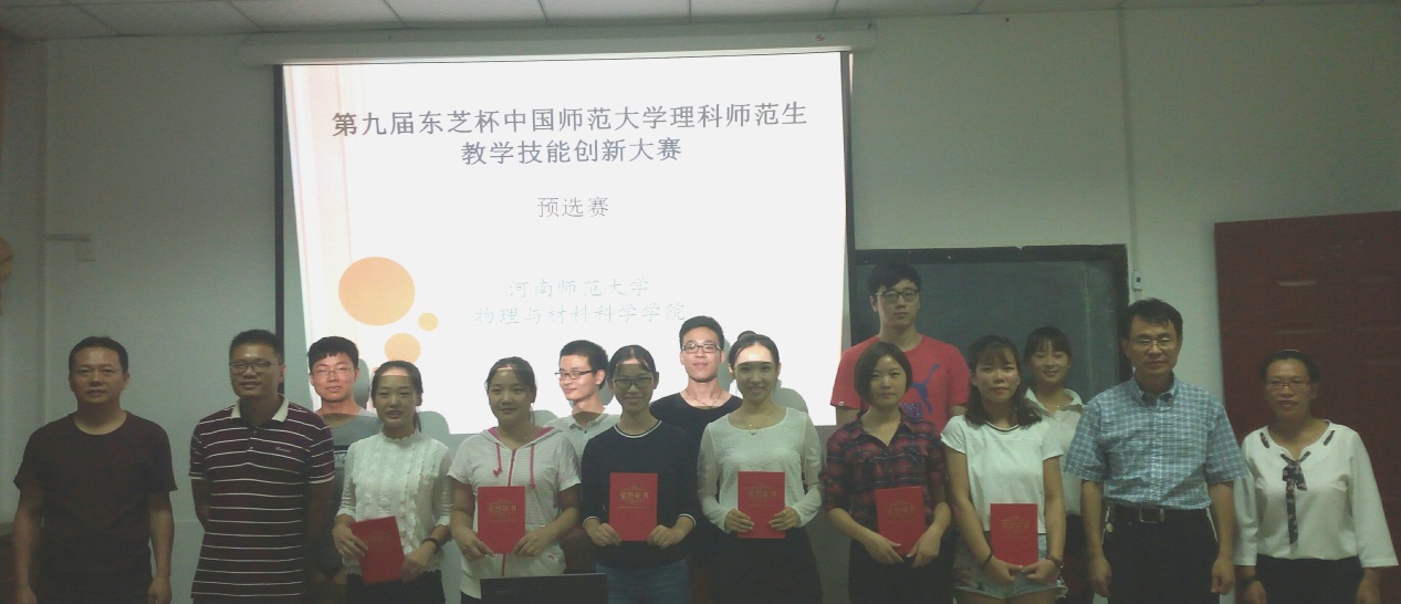 鉴于学生参赛积极性高,报名人数较多,首先进行初赛,从初赛中选出11名同学进入复赛,复赛完全按照“东芝杯”模拟授课环节进行,很多学生都自制了演示实验教具。经过激烈紧张的比赛,选出3名学生分别参加第九届“东芝杯”理科师范生教学技能创新大赛、第五届全国师范院校师范生教学技能竞赛和河南省第十五届高等学校师范教育专业毕业生教学技能比赛等,以及3名学生参加第五届“华夏杯”全国物理教学创新大赛。