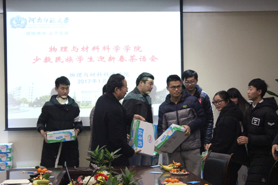 杨宗献院长代表学院向少数民族学生致以亲切的慰问和节日的祝福,他强调以后学院要在少数民族学生的思想、学习、生活等各方面给予关心和关照。杨院长同时勉励同学们学好知识,掌握技能,将来为家乡和国家的建设作出自己的贡献。李清富书记希望全体少数民族学生积极上进、奋发有为,努力做有意义和令人骄傲的事情;相互尊重、相互包容,积极做文化交流和交融的使者;勤于沟通、勤于接触,加强与辅导员、班主任、学院领导的交流。茶话会后,学院领导为同学们送上了牛奶等新年礼物,并与同学们合影留念。