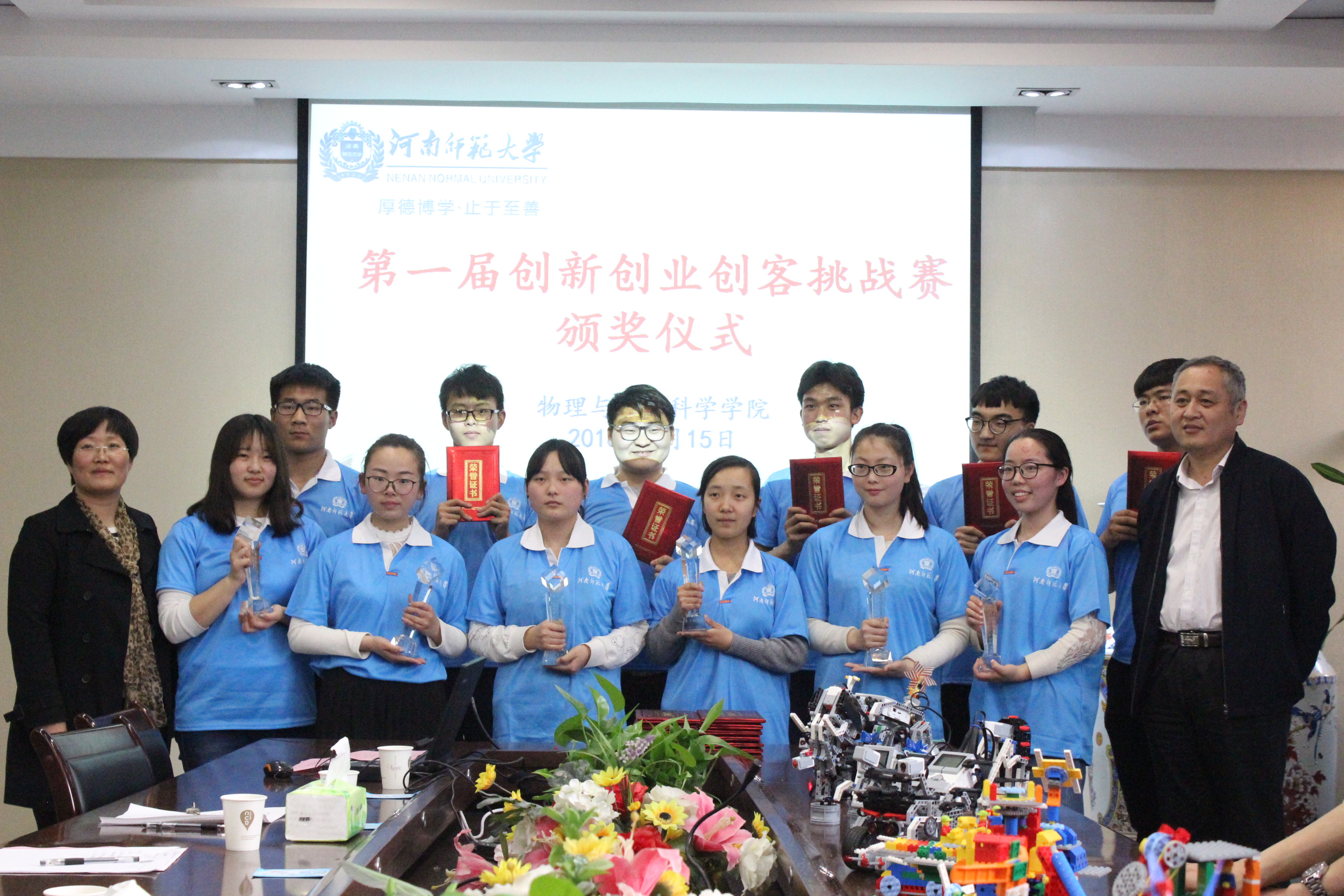 本次挑战赛以“激发创客创意活力 争做创新创业先锋”为主题,共分为人工智能组装与操作、工程模型搭建与制作、教学教具创意与设计三个比赛项目。赛事过程中,组委会举办培训会对选手的创意思路进行具体指导,并为队员参赛提供场地、设备、物料、技术等方面的支持。经过初赛的选拔和淘汰,共有18组作品入围总决赛。决赛采用路演的方式进行,比赛选手围绕作品的研究思路、技术原理、产品理念、实践应用、节能环保等方面进行阐述。经过选手们近三个小时的激烈角逐,比赛共评选出一等奖(最具创意奖)6项、二等奖12项。学院党委副书记陈明银、副院长赵旭等依次为获奖选手颁发荣誉奖杯和证书。最后,学院领导、评委老师与参赛选手合影留念。