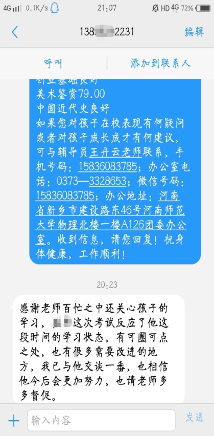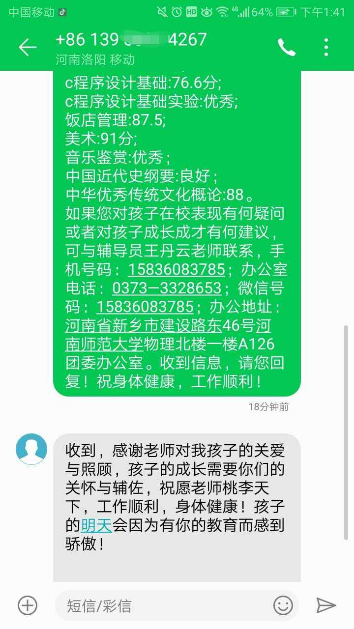在学期期末考试成绩揭晓后,学院各年级辅导员第一时间通过电话、短信、微信等方式向家长逐一通报学生成绩和在校表现。尤其是对学习态度不端正、出现多门不及格的学生,辅导员与家长进行面对面或网络视频交流,通报学生在校综合表现,分析出现问题原因,共同寻求解决措施。近年来,学院向家长通报学生成绩工作受到了家长和学生的热烈欢迎和充分认可。