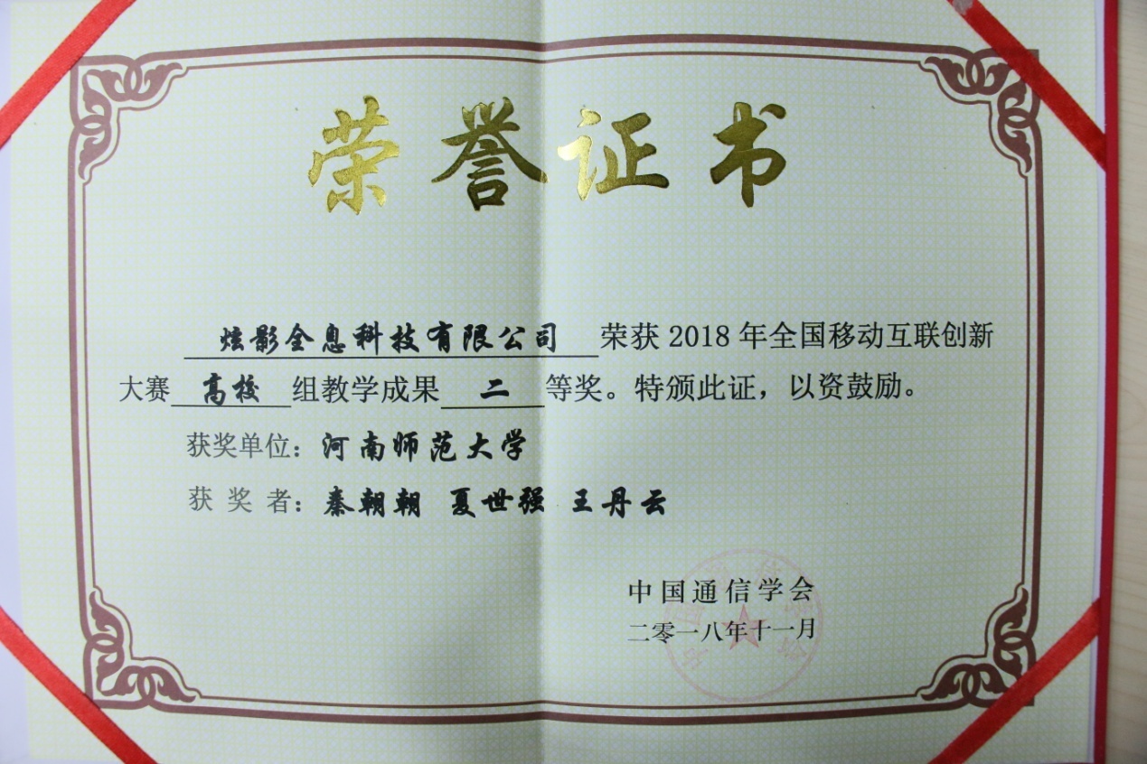 11月11日,2018第四届全国移动互联创新大赛在山东理工大学落下帷幕。总决赛为期三天,来自全国各大高校600多名师生、近百家创新企业、280多个创新创业项目参与了角逐。经过现场答辩、专家评审等环节的激烈比拼,我院秦朝朝、夏世强、王丹云老师指导,董瑞超、王雨凡、胡速通、石雨倩等同学参与的创新创业参赛项目《炫影全息科技有限公司》荣获二等奖。