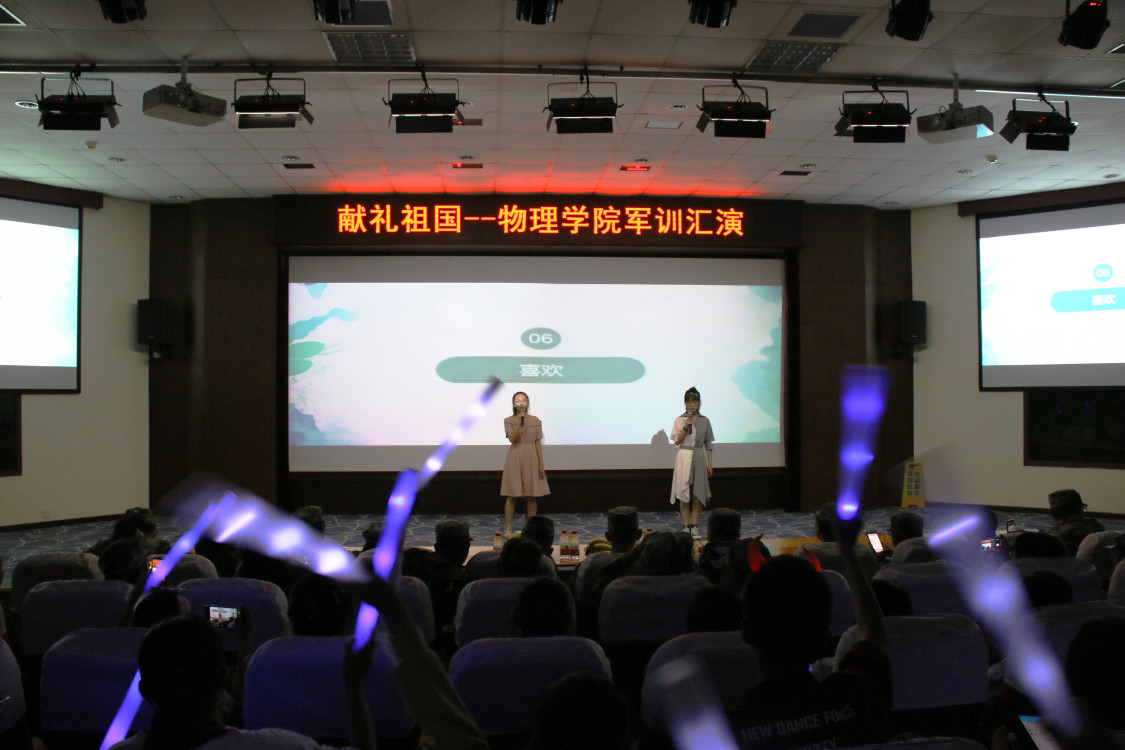 一曲温柔抒情的《我怀念的》拉开了军训汇演的帷幕,动人心弦的旋律唤醒同学们心中最美好的时光以及军训的酸甜苦辣。随后,《爱河》、《最初的梦想》、《有何不可》等十九歌曲轮番上阵,给大家带来了不一样的听觉体验。《精忠报国》以震撼人心的旋律、恢宏壮丽的气势,道出对祖国的热爱与守护。《追光者》词意真切,诉说着对光的追求。一月有三旬,皆是奋斗日,《理想三旬》娓娓道出学生们对梦想的坚持。汇演更有新生辅导员张浩兴的倾情相助,他个人独唱《淘汰》,简单的曲调和浅白的歌词却彰显了人生的规则、努力的拼搏与无情的淘汰,这是物理人的告白。“感觉有双翅膀,能飞越高山和海洋”,由蔡美慧同学演唱的《你曾是少年》将同学们带入了音乐的殿堂。台上用心表演,台下听众挥舞荧光棒,气氛极佳。军训汇演在《我和我的祖国》中接近了尾声,在场的同学都放声歌唱,来表达对祖国的热爱和祝福!