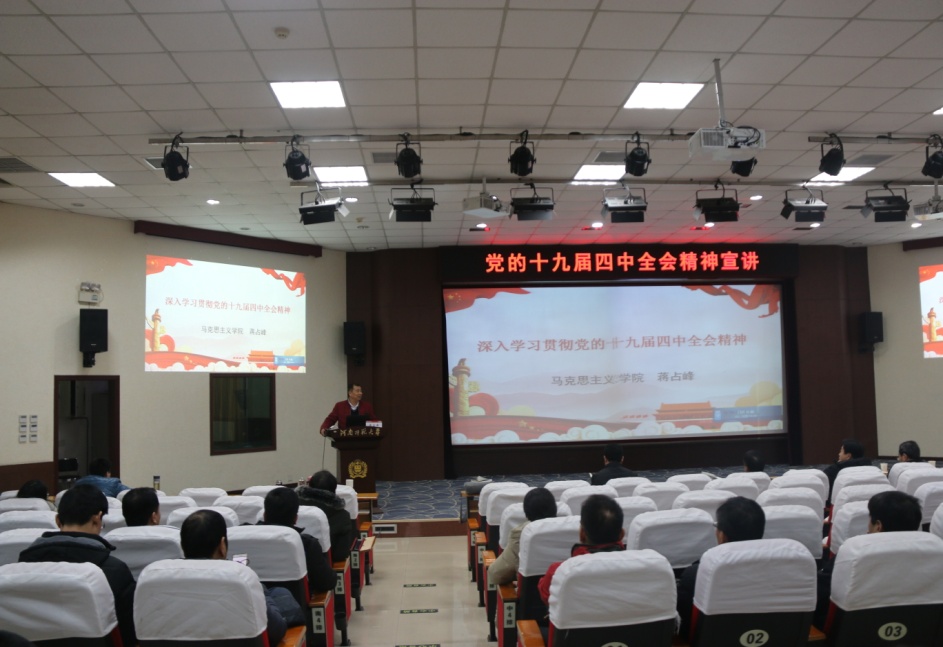 为深入学习宣传党的十九届四中全会精神,动员全院师生把思想和行动统一到全会精神上来,按照校党委宣传部统一安排,12月24日下午,物理学院组织开展党的十九届四中全会精神宣讲活动,马克思主义学院党委书记蒋占峰担任宣讲人。