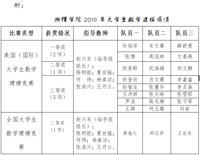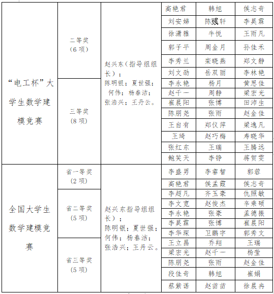除荣获全国大学生数学建模竞赛二等奖外,我院学生在本年度的各类数学建模竞赛中全面开花,均再创历史佳绩。今年,我院共荣获美国(国际)大学生数学竞赛一等奖2项、二等奖1项、三等奖5项;“电工杯”大学生数学竞赛二等奖6项、三等奖8项;获全国大学生数学竞赛省级一等奖2项、省级二等奖5项、省级三等奖5项。