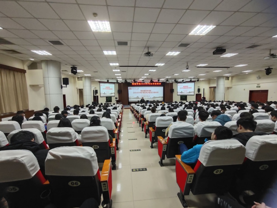 端正考风,严肃考纪。为进一步加强学生考风考纪教育,构建诚信校园,营造公平公正的考试环境,物理学院于1月2日晚在物理北楼报告厅举行考风考纪培训大会。2019级全体学生参加本次大会。