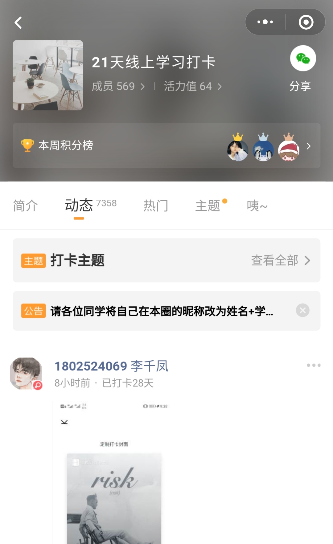 本次活动借助微信平台建立“打卡圈”,鼓励学生们通过图片、视频、文字等方式多视角、立体式分享在家学习、健身的生活状况。学生打卡内容广泛,除专业知识外,还涉及书籍、绘画、音乐、运动等方面,活动负责人每日会根据具体打卡情况选出1份优秀打卡内容设为置顶日记。在相互督促、相互学习的过程中,学生们共同提高,增强凝聚力,齐心协力度过此次疫情难关。目前,21天线上学习打卡活动已圆满结束,正对积极参与者进行奖励,打卡15-20天可获得3学时,打卡21天及以上可获得5学时。