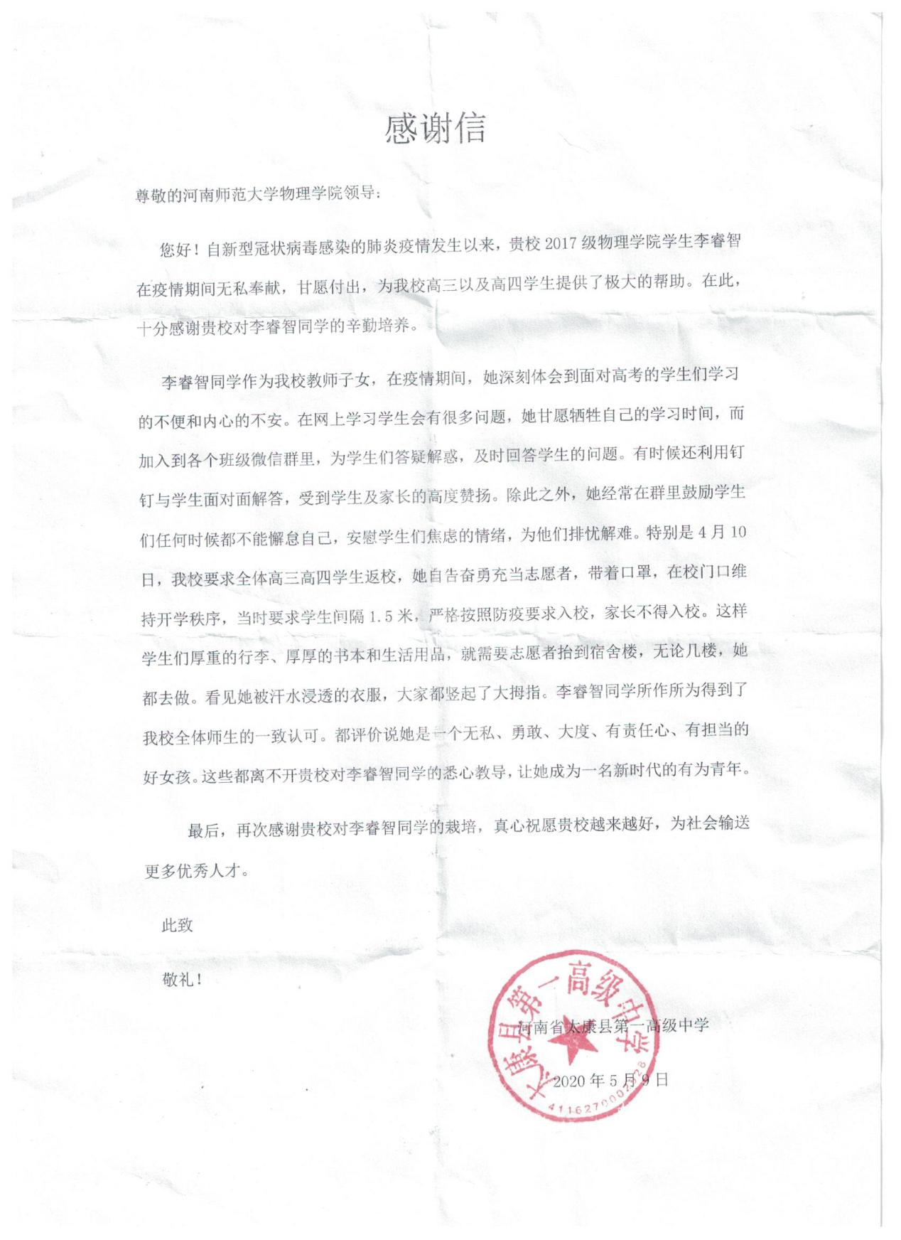 近日,周口市太康县第一高级中学给我院寄来《感谢信》,感谢疫情防控期间我院2017级物理学专业李睿智同学充分发挥共产党员的先锋模范作用,不怕吃苦、乐于奉献、勇于担当,在该校高三年级复学期间积极参与疫情防控志愿服务工作,感谢学院对李睿智同学的培养教育,祝愿我院为社会输送更多优秀人才。