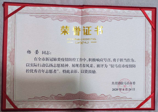 近日,共青团驻马店市委下发通知,决定表彰杨莹等101名青年为“驻马店市疫情防控优秀青年志愿者”,“跑小青”青年突击队等32个青年集体为“驻马店市疫情防控优秀青年志愿者集体”。我院2017级物理学专业杨莹同学受到表彰,被评为市疫情防控优秀青年志愿者荣誉称号。